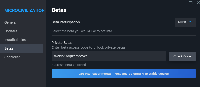Just go to the Steam, find Microcivilization in your library, go to its Properties, Betas and insert your key to the text box.